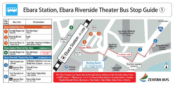 When switching buses at JR Ebara Station, there is a 3-minute walk between the bus stop to/from Kannabe Snow Village and the bus stop to/from Osaka.