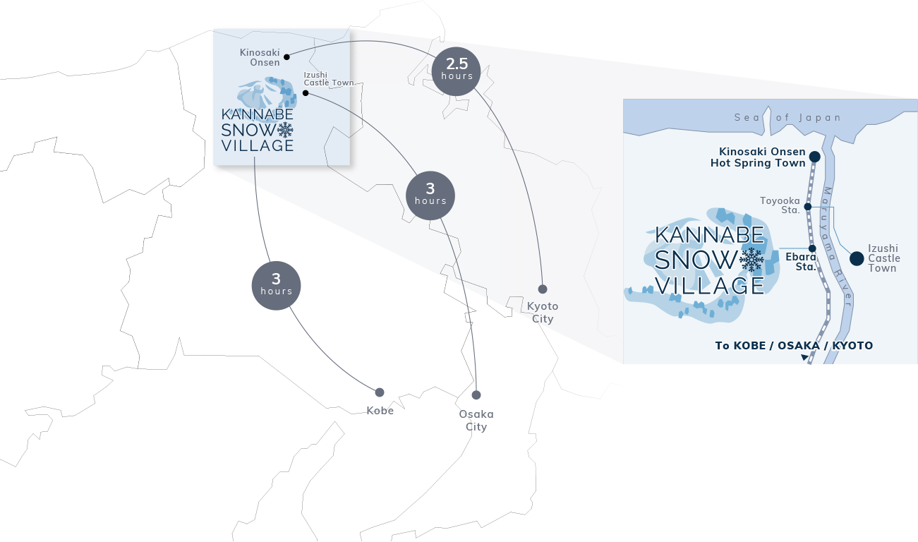 It takes approximately 60 minutes to travel from Kinosaki Onsen Station to Kannabe mountains and ski areas.